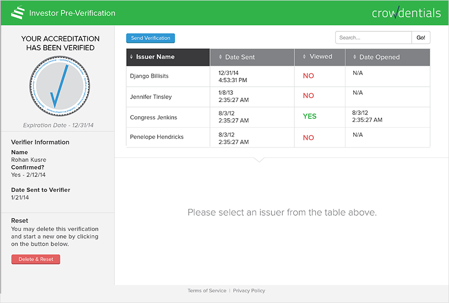 The Crowdentials Investor Verification application was based around providing investors with a way to verify their income and/or net worth without releasing any personal financial information.